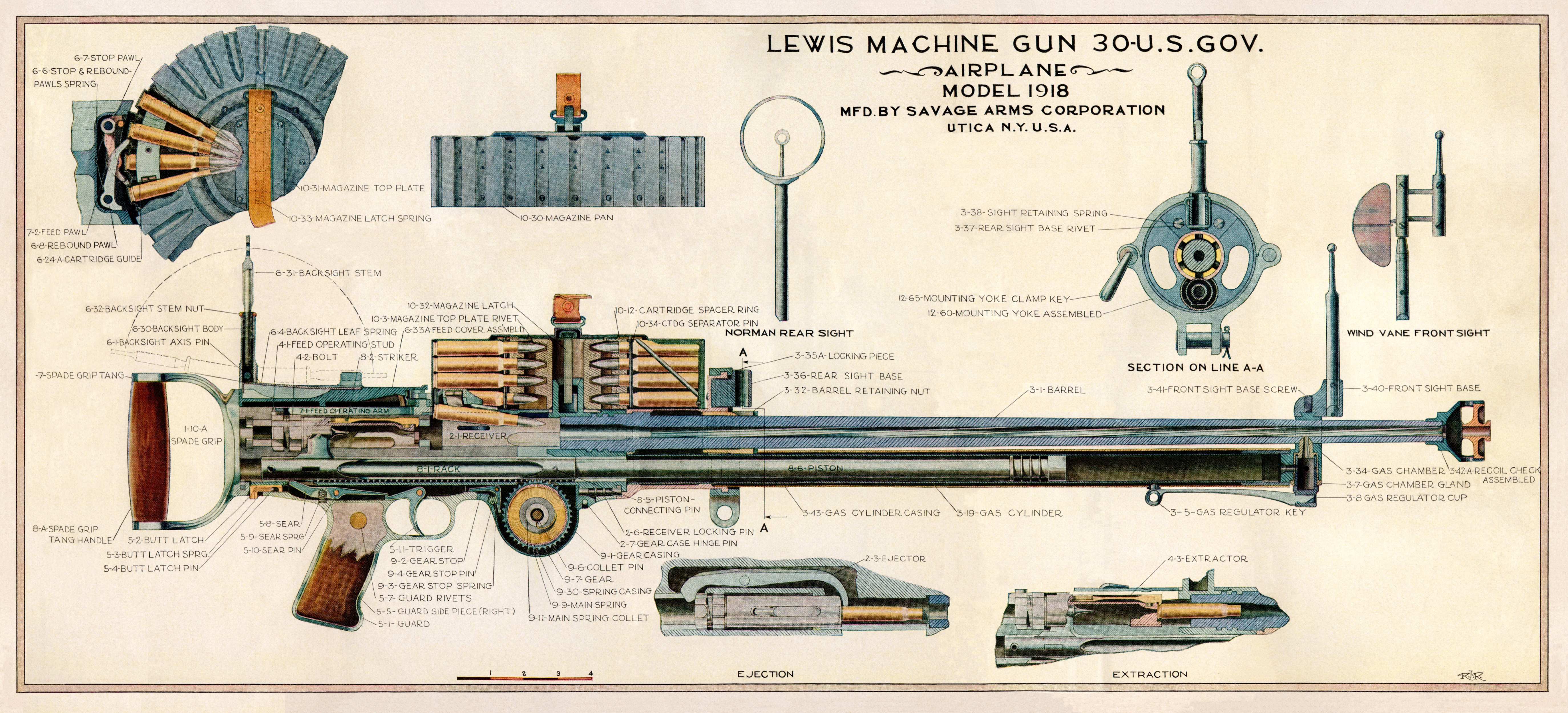 The Lewis Machine Gun Was produced in the United Kingdom and the United States and was one of the most important aircraft weapons used by most Allied airforces in World War I. It was also used by land and naval forces, however this manual is specifically for the Aircraft version. Many of these weapons were also utilised during the second world war. The Lewis has the distinction of being the first machine gun fired from an aircraft in 1912 and just some of the famous aircraft equipped with the Lewis included: